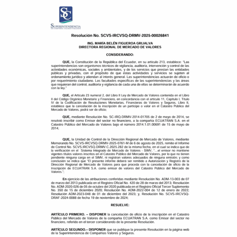 Noticias Resolución sobre la cancelación de inscripción de ECUATRAN SA en el Catastro Público del Mercado de Valores Leer más » 22/08/2025